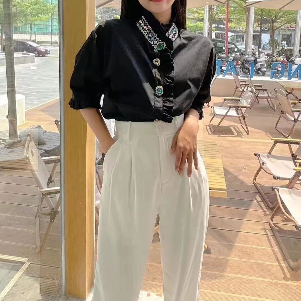 Find elegance and exclusivity in our white blouse with rhinestone finishes and button and ruffle details! Made of premium cotton, this blouse will make you stand out on any occasion with its high neck and short sleeves. Enjoy a comfortable and avant-garde style with our White Blouses for Women Shirts.Fabric Type: Nylon Cotton