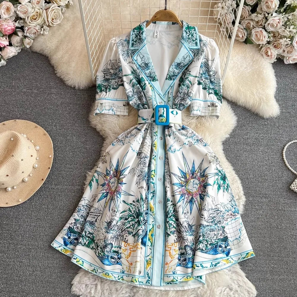 Single-breasted dress with stand-up collar and print, belt and high-quality flared sleeves