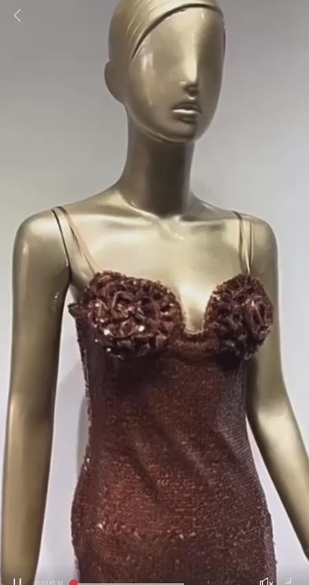 Elegant Sexy Sleeveless Backless Flower Mesh Sequin Brown Shiny Bodycon Long Dress