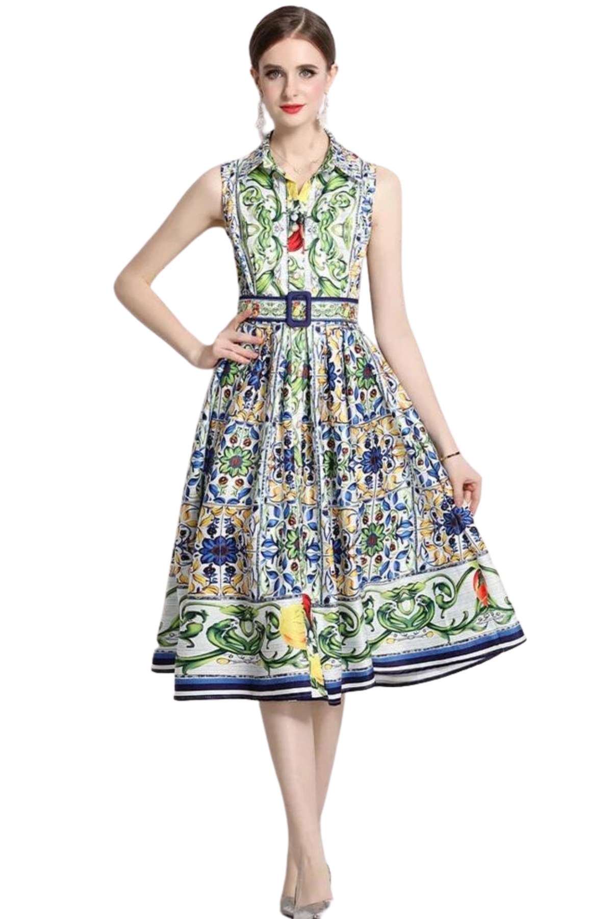 High Quality Flower Print Belted Turn-down Collar Sleeveless One-Breasted Flare Dress