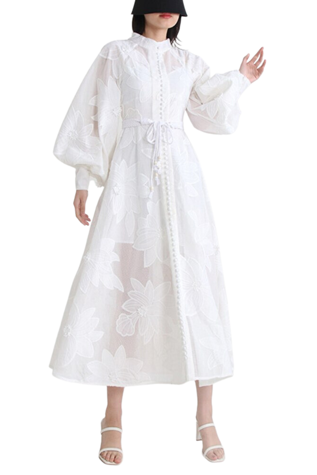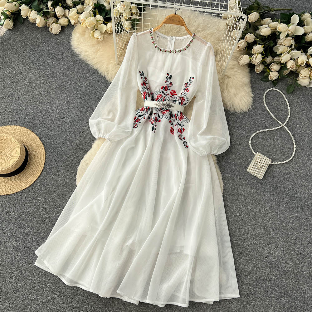Elegant dress with flower embroidery O-neck and long puff sleeves and high quality belt