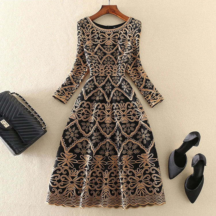 Dress Women 3/4 Sleeve 3D Gold Flower Embroidery Elegant Midi High Quality