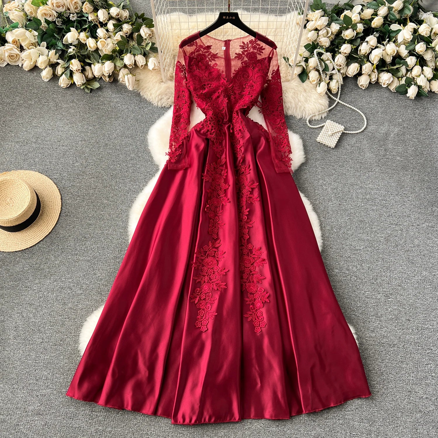 High Quality Vintage Floral Embroidery Mesh Long Sleeve Red Dresses