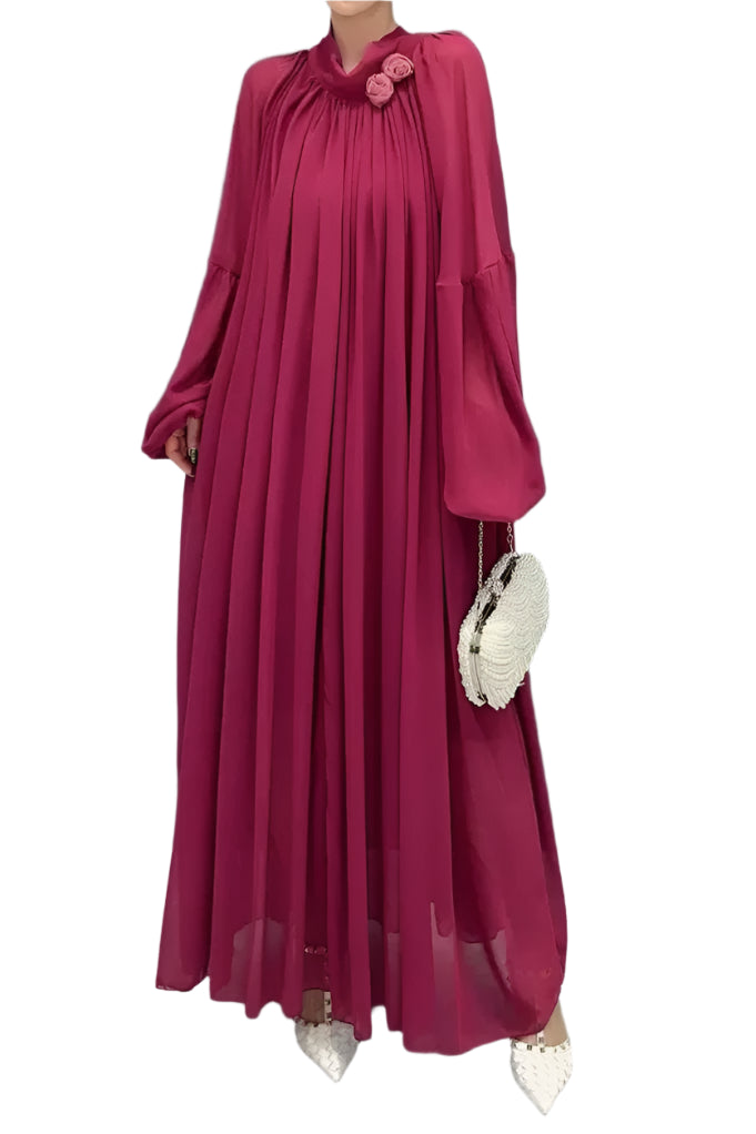 High Quality Purple/Black/Red Diamonds Draped Pleated Chiffon Elegant Puff Sleeve Long Dress