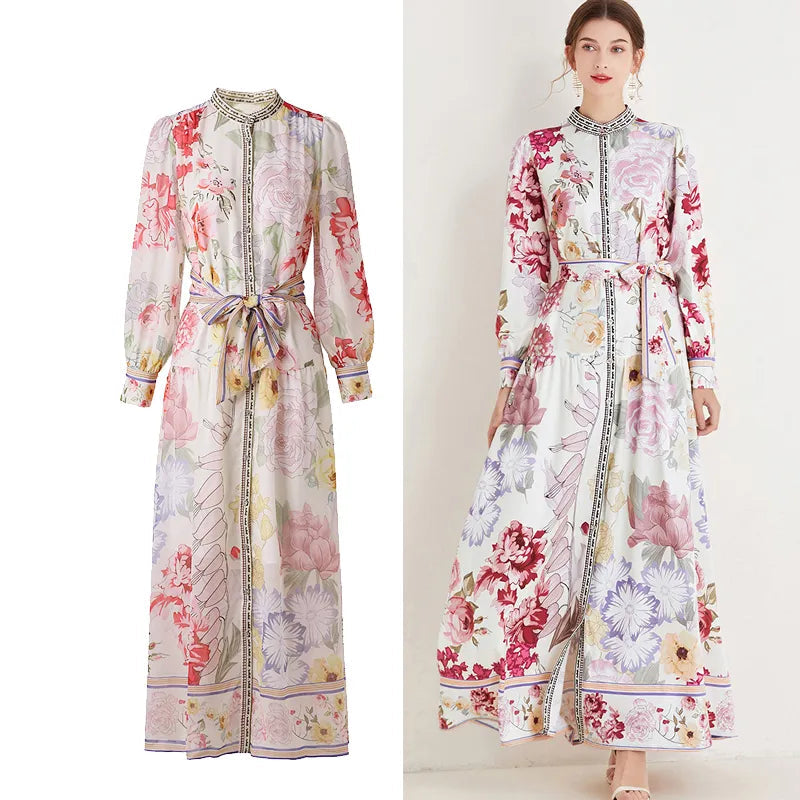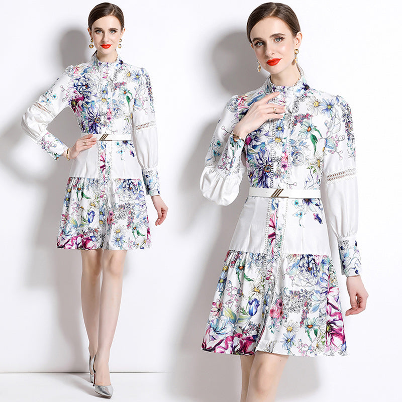 High Quality Long Sleeve Stand Collar Print Floral Dress