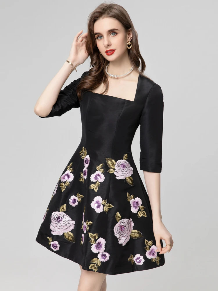 High Quality Elegant Flower Embroidery Pink Black Square Collar Half Sleeve Women Mini Dress