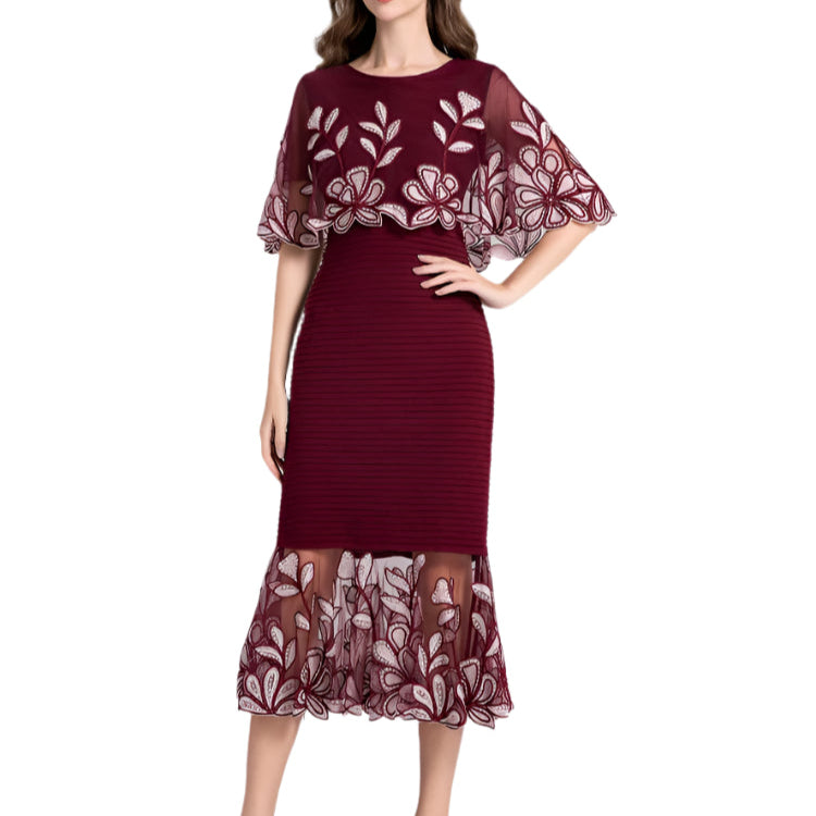 Cape dress with sleeve, flower embroidery, slim mesh, high quality elegant