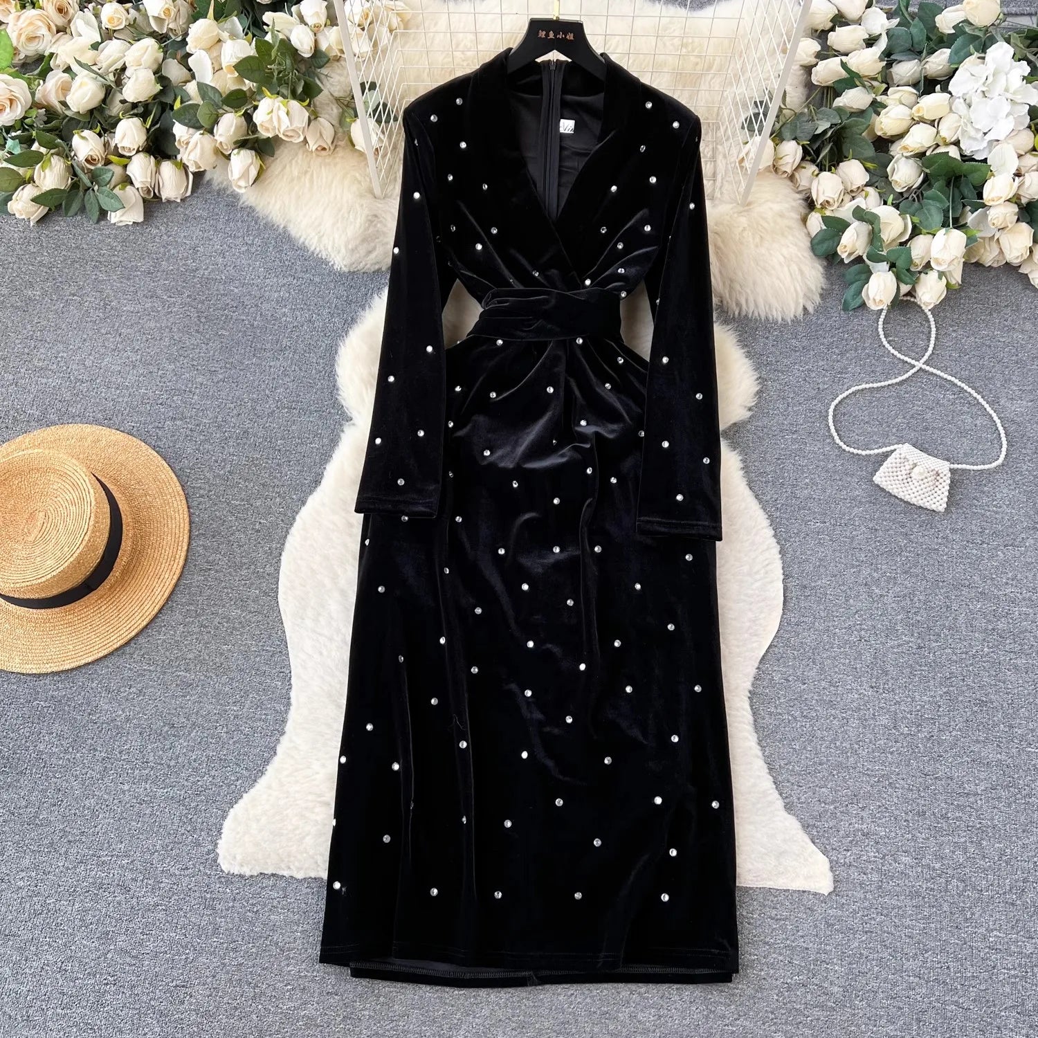 High Quality Long Sleeve V Neck Thick Velvet Diamond Embellished Dress
