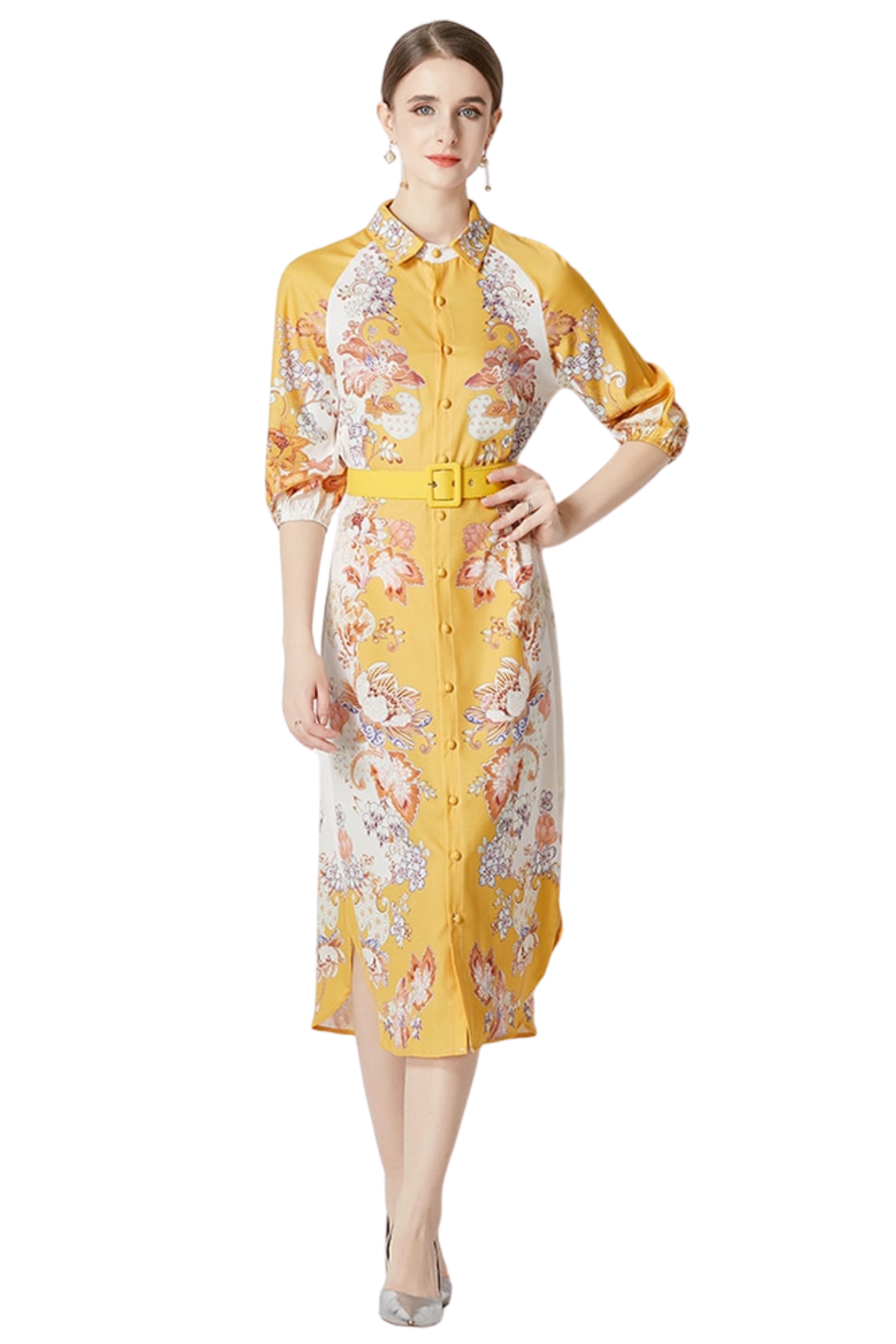 Dress High Neck Puffed Sleeve Floral Print with Belt