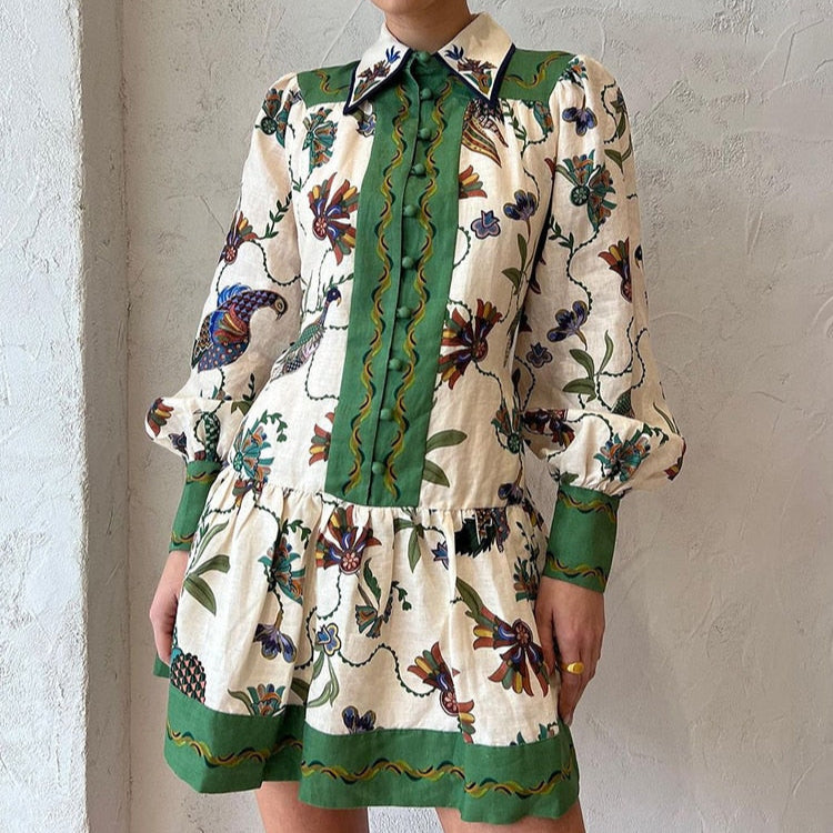 High Quality Single Breasted Long Flare Sleeve Loose Flower Print Pleated Mini Dress