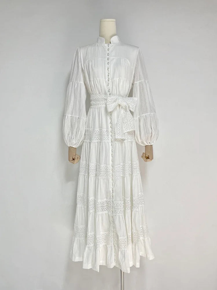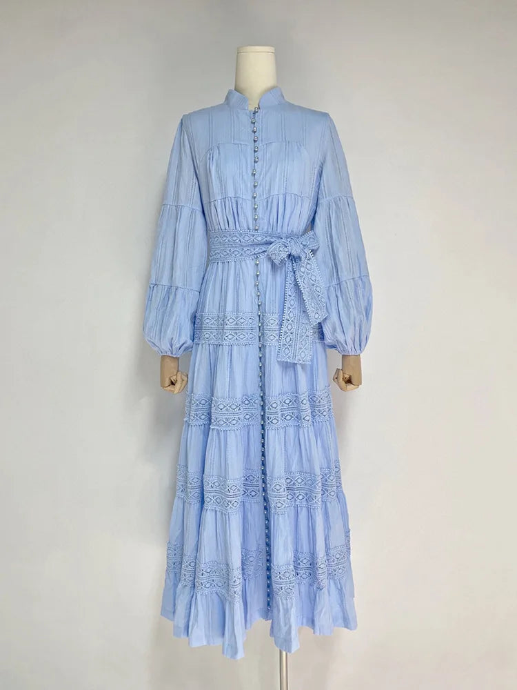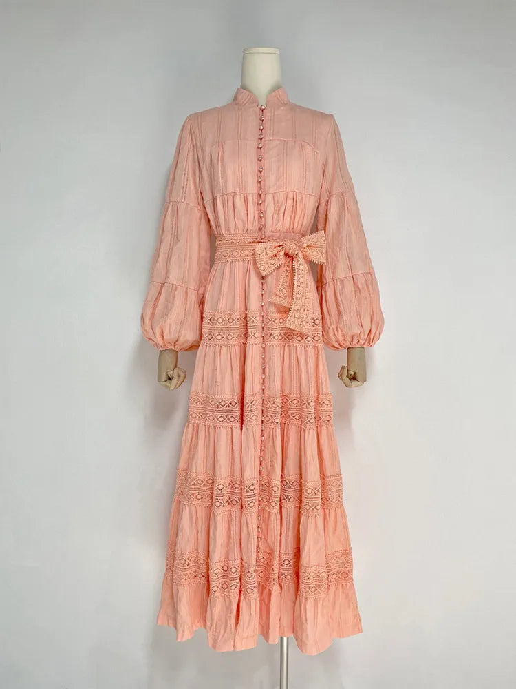 Elegant dresses with stitching and stand collar, bell sleeve with single row of high quality buttons.