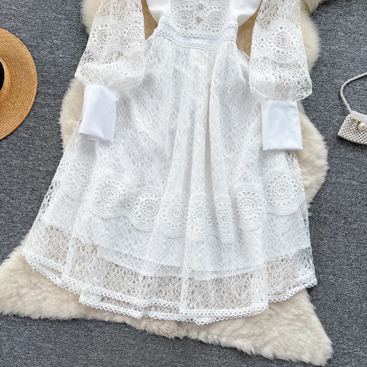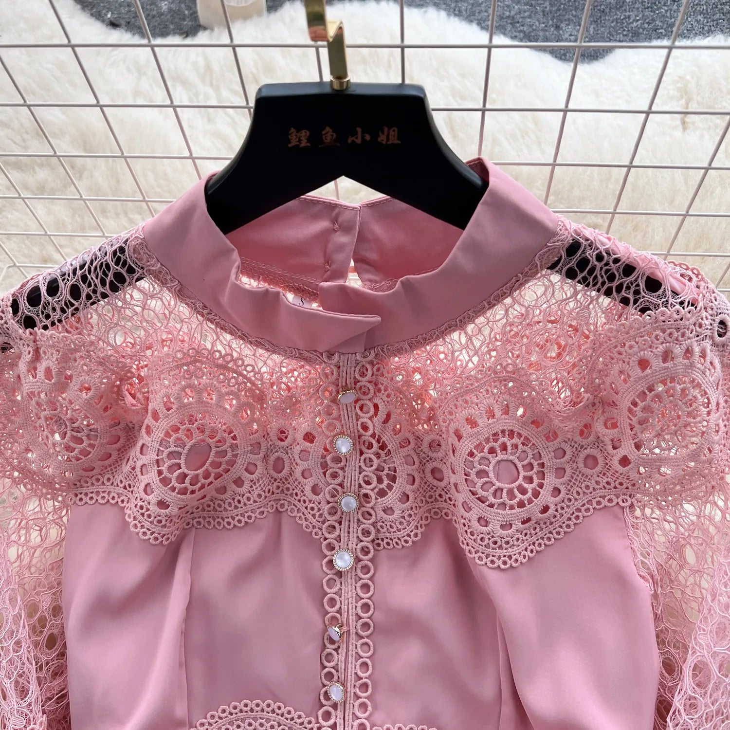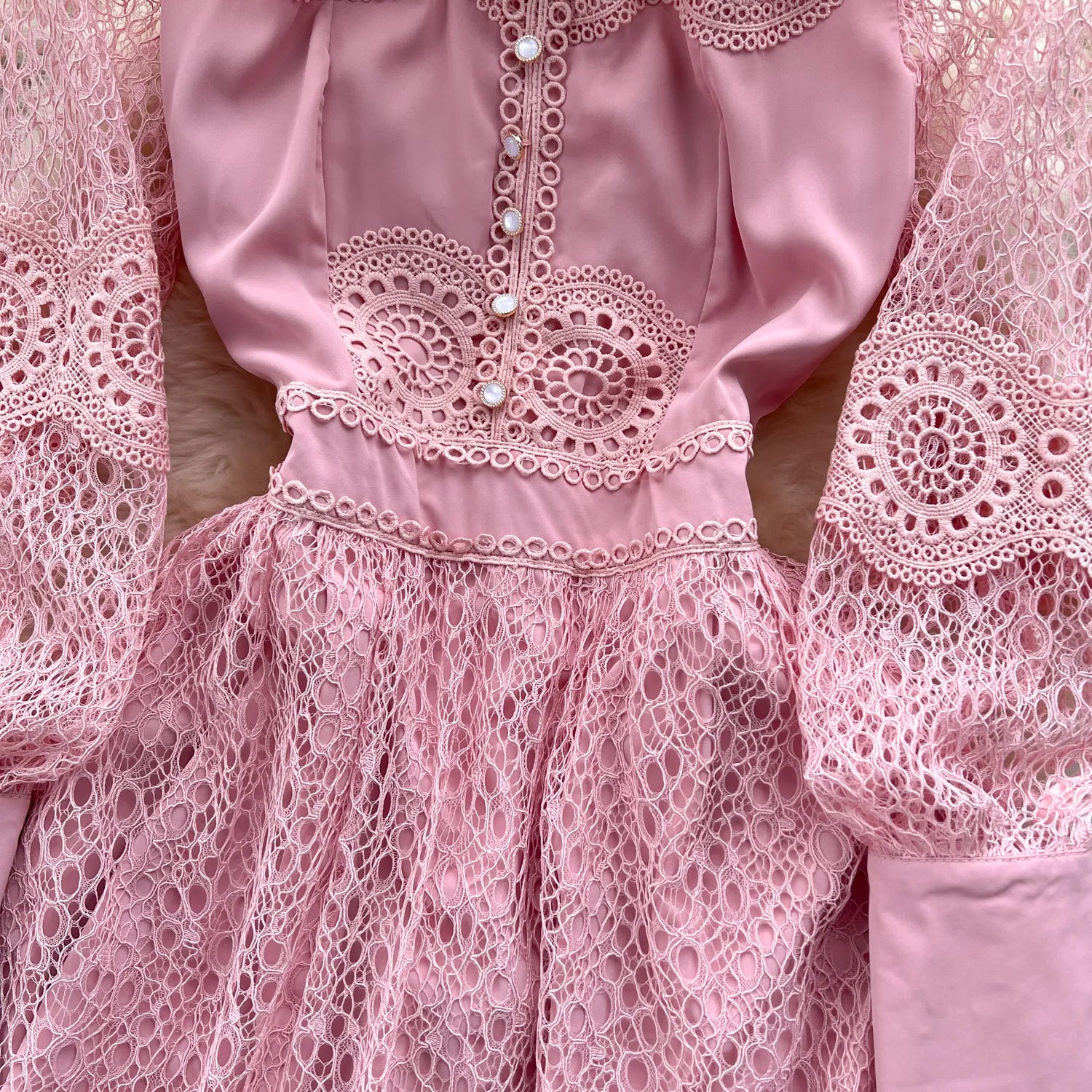 Discover the timeless elegance of the French Lace Dress Court Women. With a delicate solid lantern sleeve and intricate hollow out design, this retro ladies' dress radiates refinement and grace. Enhance your wardrobe with this luxurious and fashionable long dress.