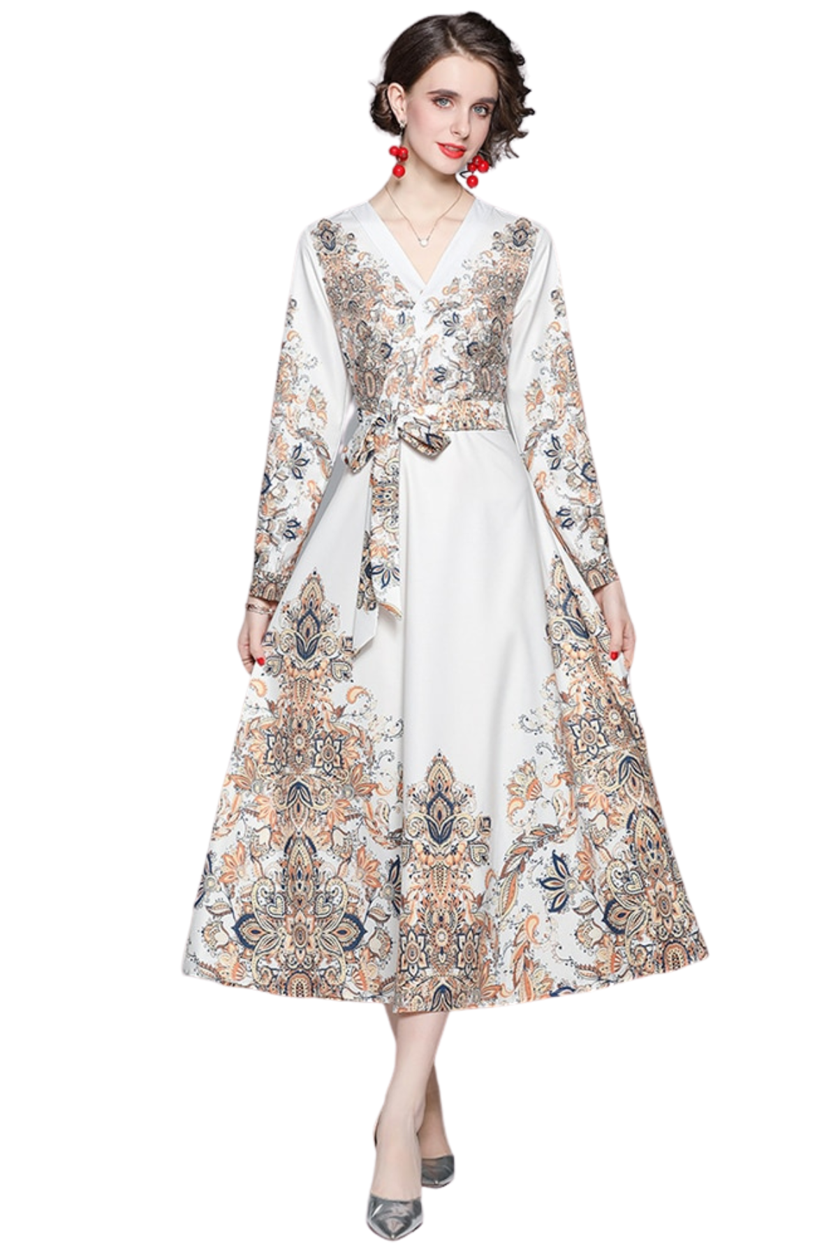 Printed Maxi Dress High Neck Long Lantern Sleeve High Quality Belt