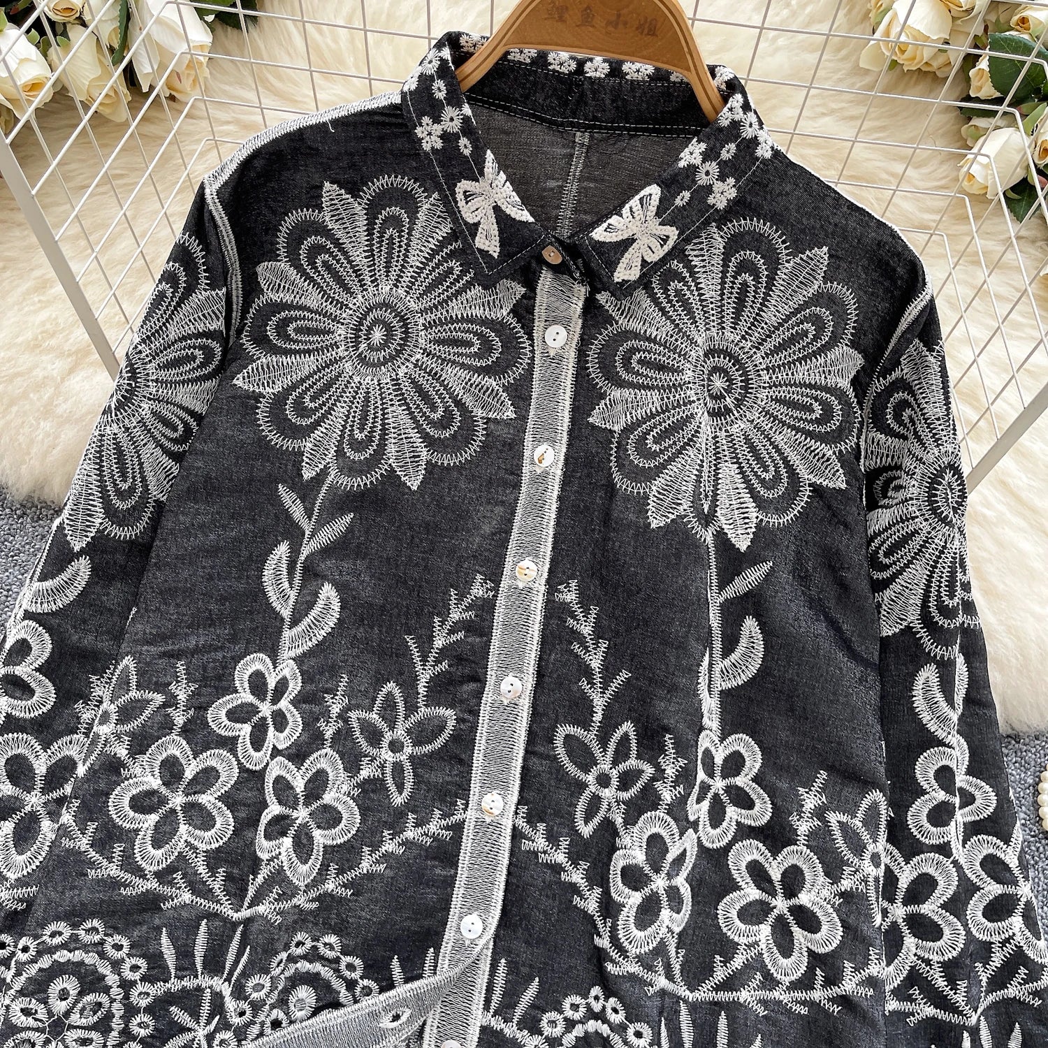 Basic loose long-sleeved polo-neck blouse embroidered with flowers and French-style hook