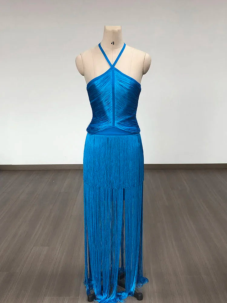 Two Piece Set Blue Halter Backless Crop Top + High Quality Fringe Bodycon Skirt