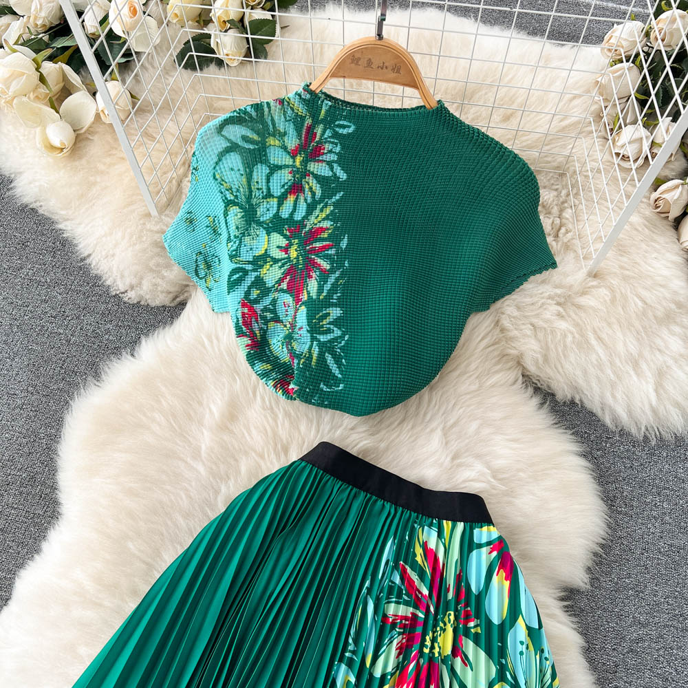 Two Piece Set Floral Print Pleated Elastic Raglan Sleeve T-shirt Top + Long Skirt High Quality