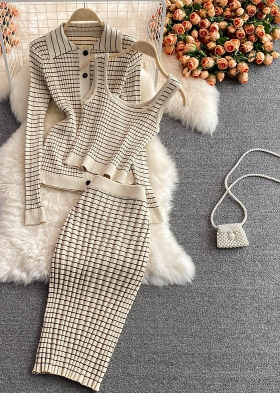 Temperament 3 Piece Set Plaid Knit Cardigan Bottoming Camisole Skirt
