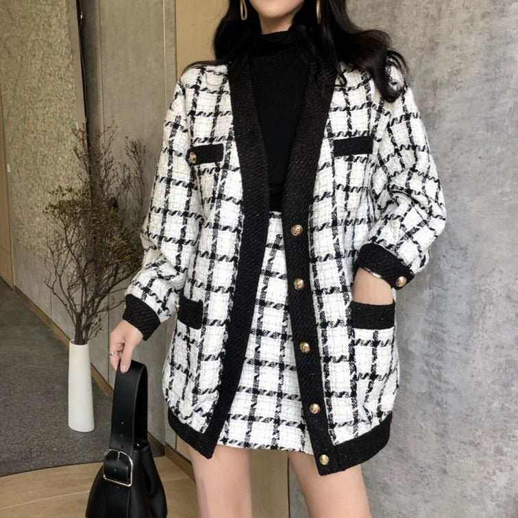 2 Piece Set Elegant Vintage Plaid Tweed Long Sleeve Jackets Coat + Mini A-line Skirts