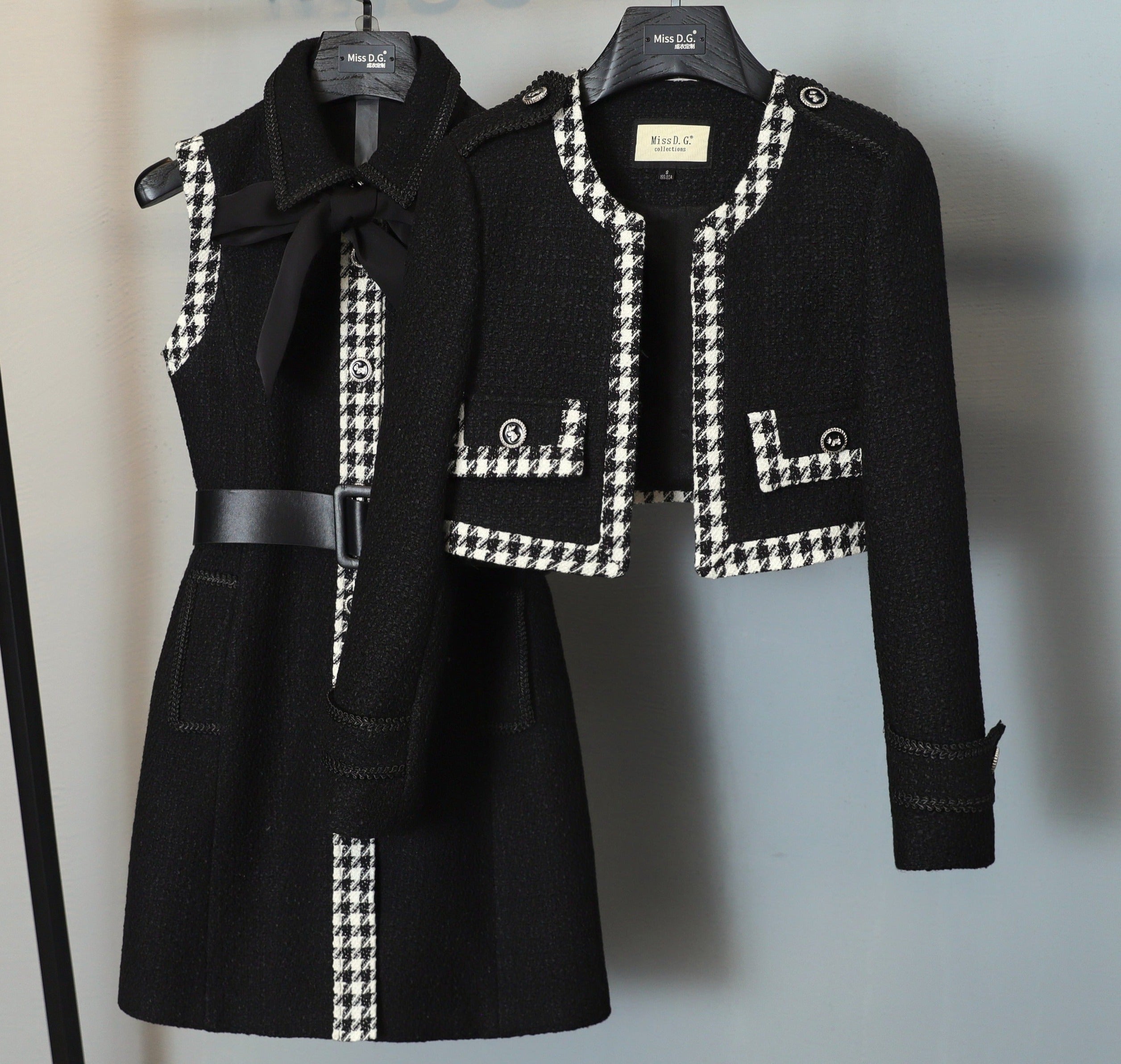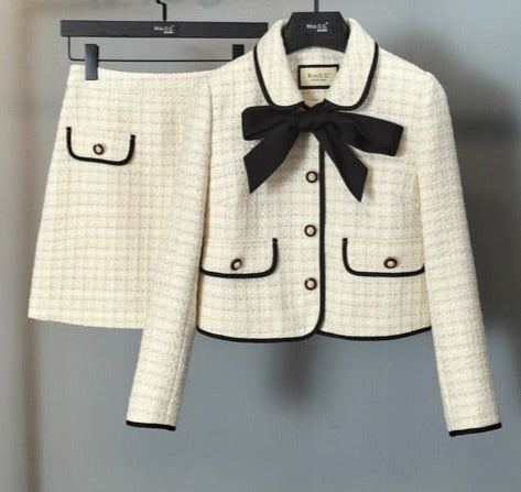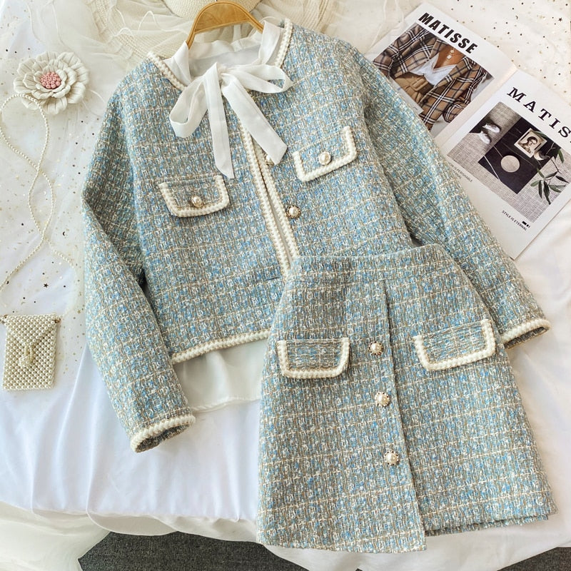 Two Piece Set Long Sleeve Tweed Woolen Jacket, Coat + Woolen Mini Skirt