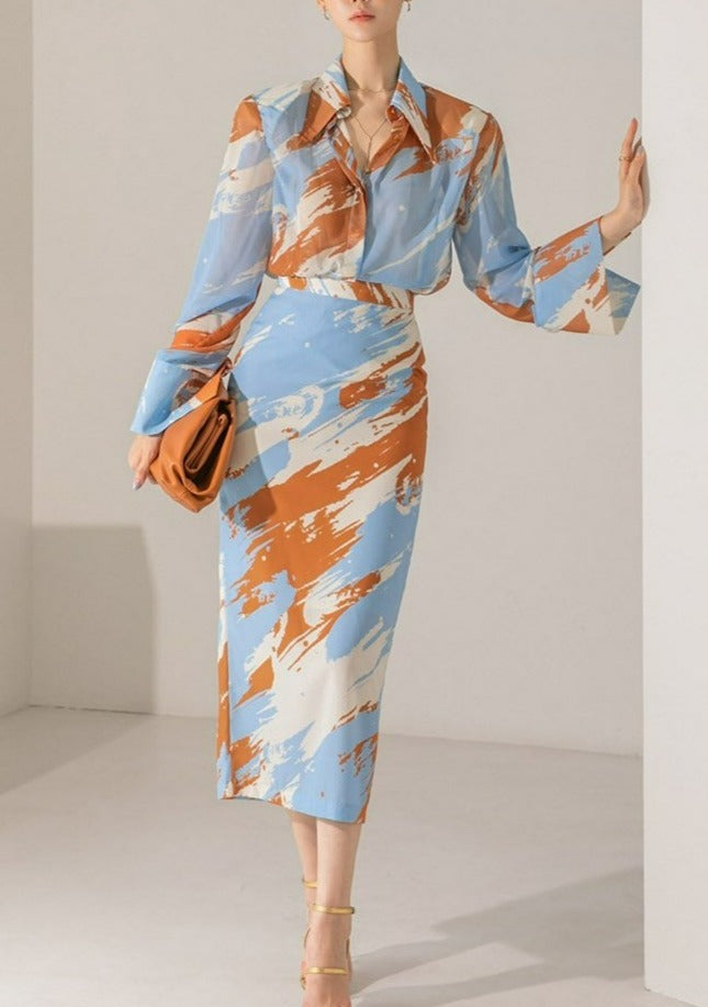 Womens Print 2 Piece Outfits Long Sleeve Shirts; Casual Fashion Sheath Pencil Skirt Simple Work Sets