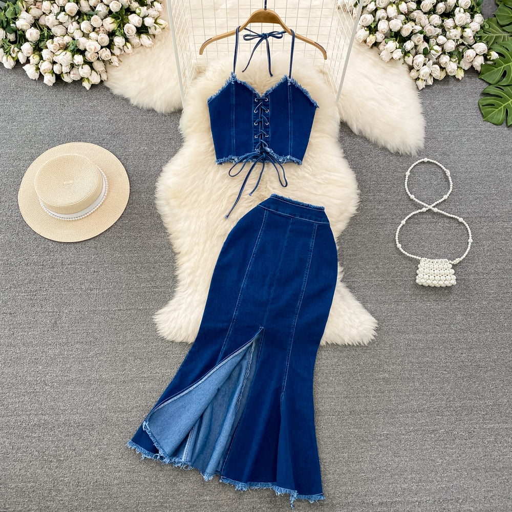 High Quality High Waist Mermaid Skirt Two Piece Set Tank Top + High Waist Mermaid Skirt