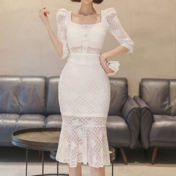 2 Piece Set Elegant Lace V Neck Puff Sleeve Crop Tops + High Waist Mermaid Bodycon Skirt
