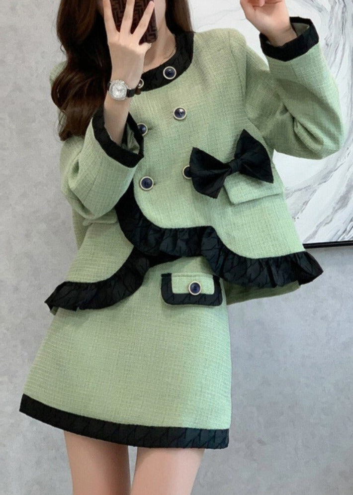 French Style Two Piece Suit Vintage Bow Ruffles Coat Simple Solid Skirt