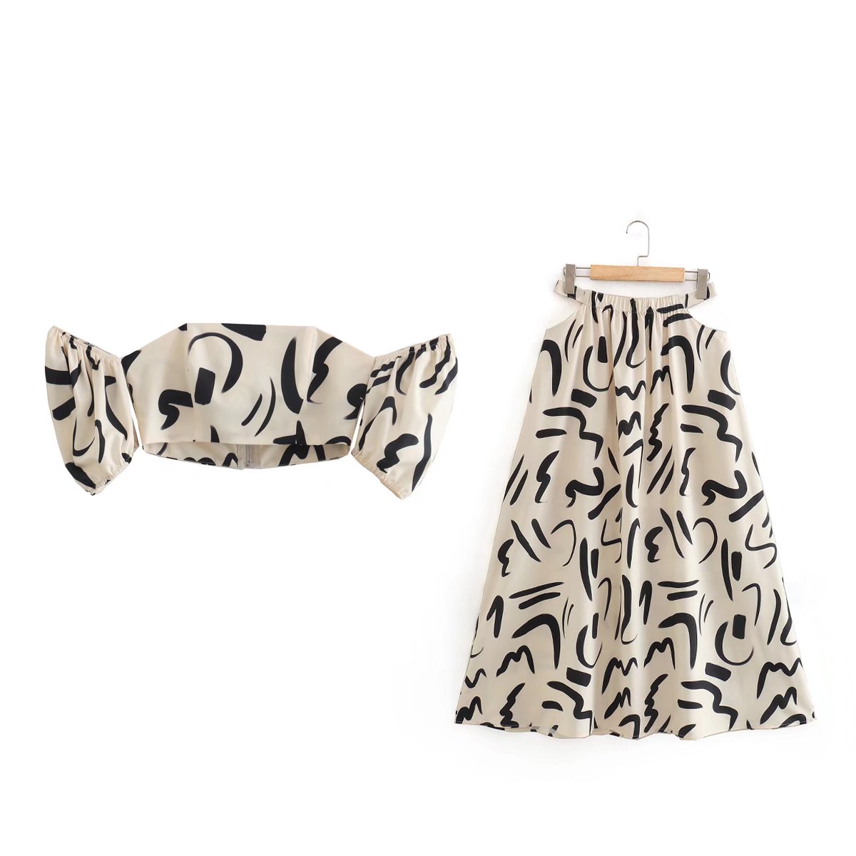 Hollow Out Waist Flare Skirt Graffiti Print Strapless Tops Set