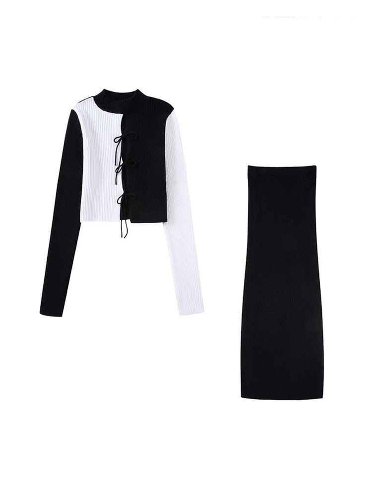 Sexy O Neck Knitted Sweater 2 Piece Set Crop Top + Bodycon Mini Skirt