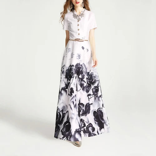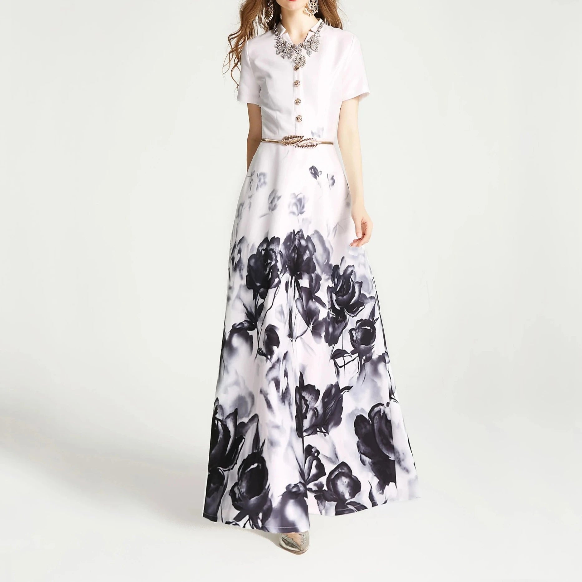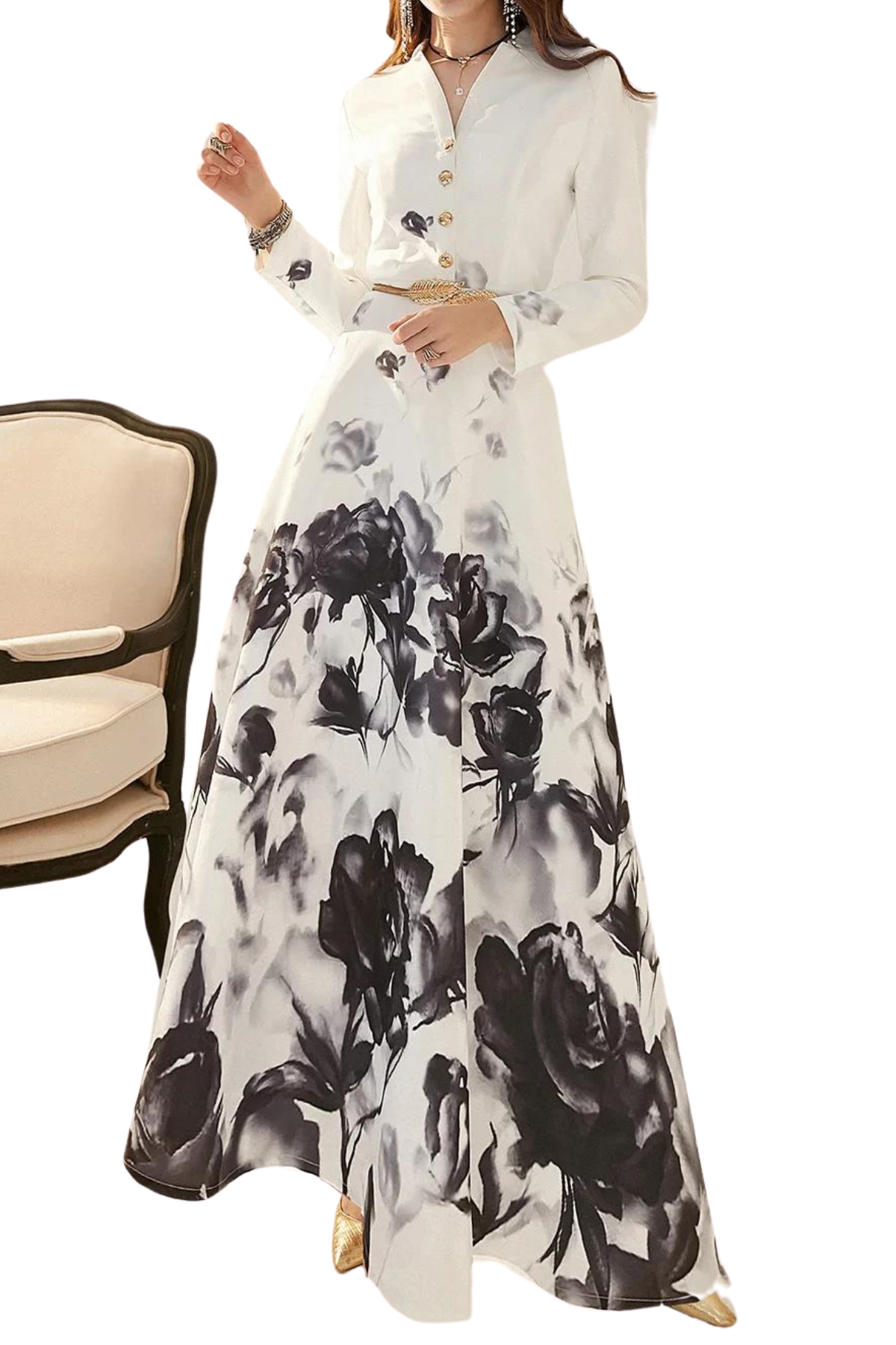 Discover the elegance and sophistication of our new long dress for women. With its V-neck and retro print, you will be transported back to the time of Audrey Hepburn. Made with high quality materials, this dress is perfect for any occasion and will make you look delicate and stylish.