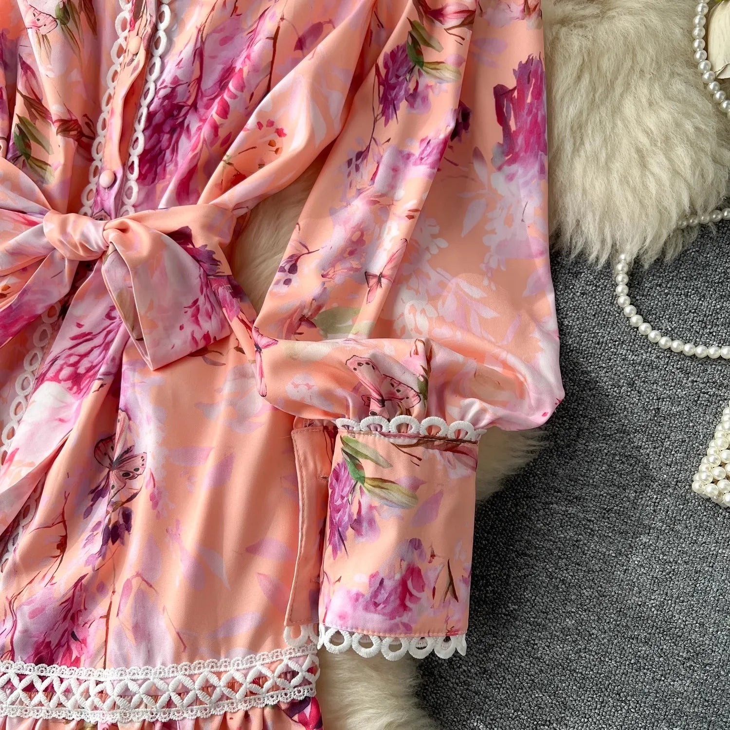Discover bohemian elegance with our long summer dress. Designed with puff sleeves, buttons and lace details in a floral print, this flowy dress will make you feel sophisticated and exclusive. Perfect for a summer afternoon or an outdoor dinner. Make a fashion statement with this bohemian dress!