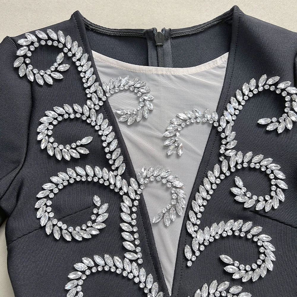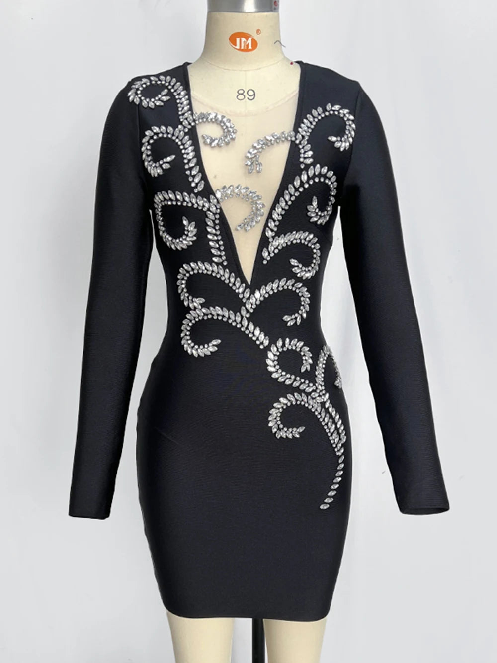 Sexy V Neck Mesh Long Sleeve Luxury Shiny Diamond Bodycon Mini Dress Elegant High Quality