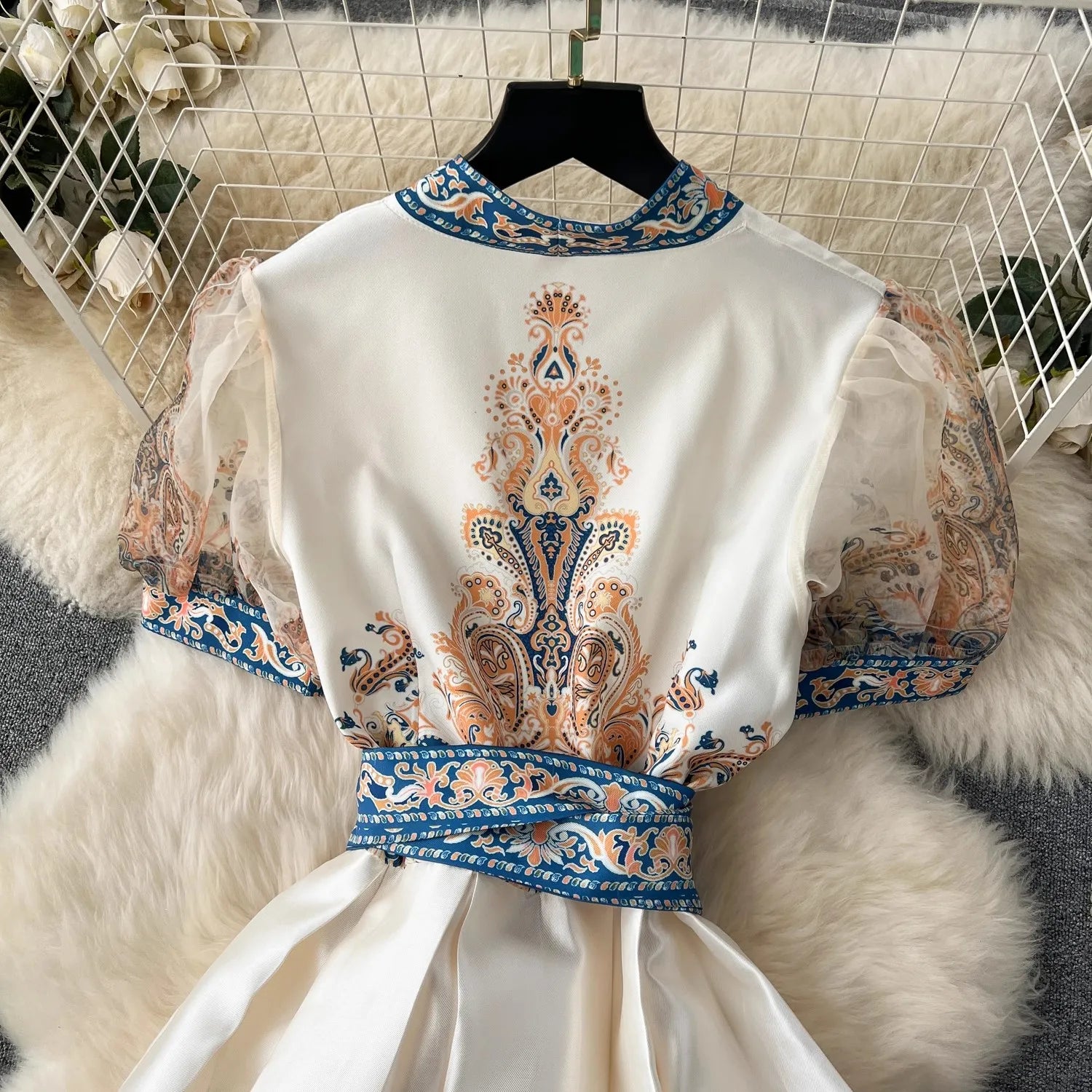 High Quality Flower Print Cross V Neck Puff Short Sleeve Long Dresses