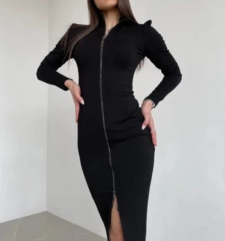 High Quality Bodycon Long Sleeve Stand Collar Full Zipper Midi Dress