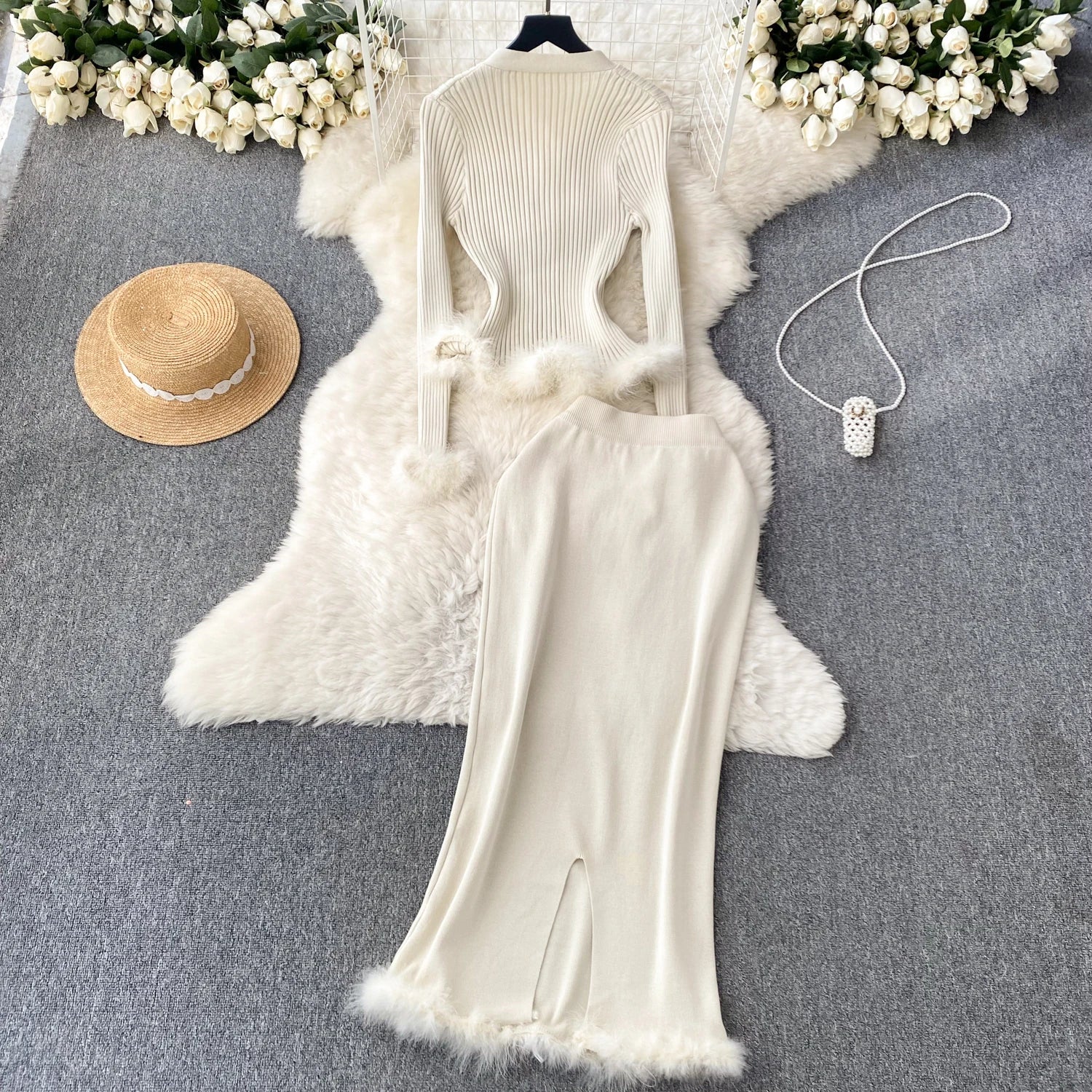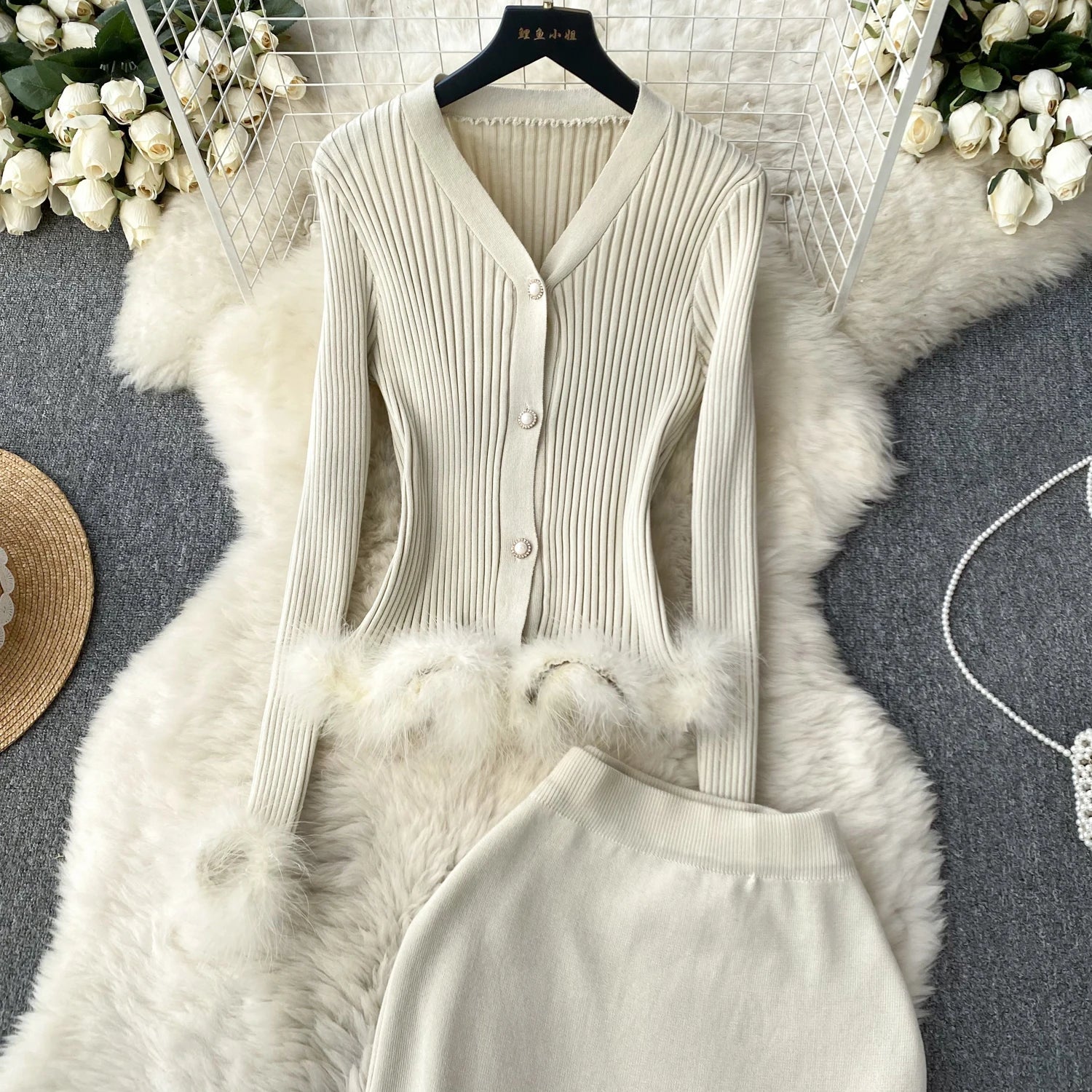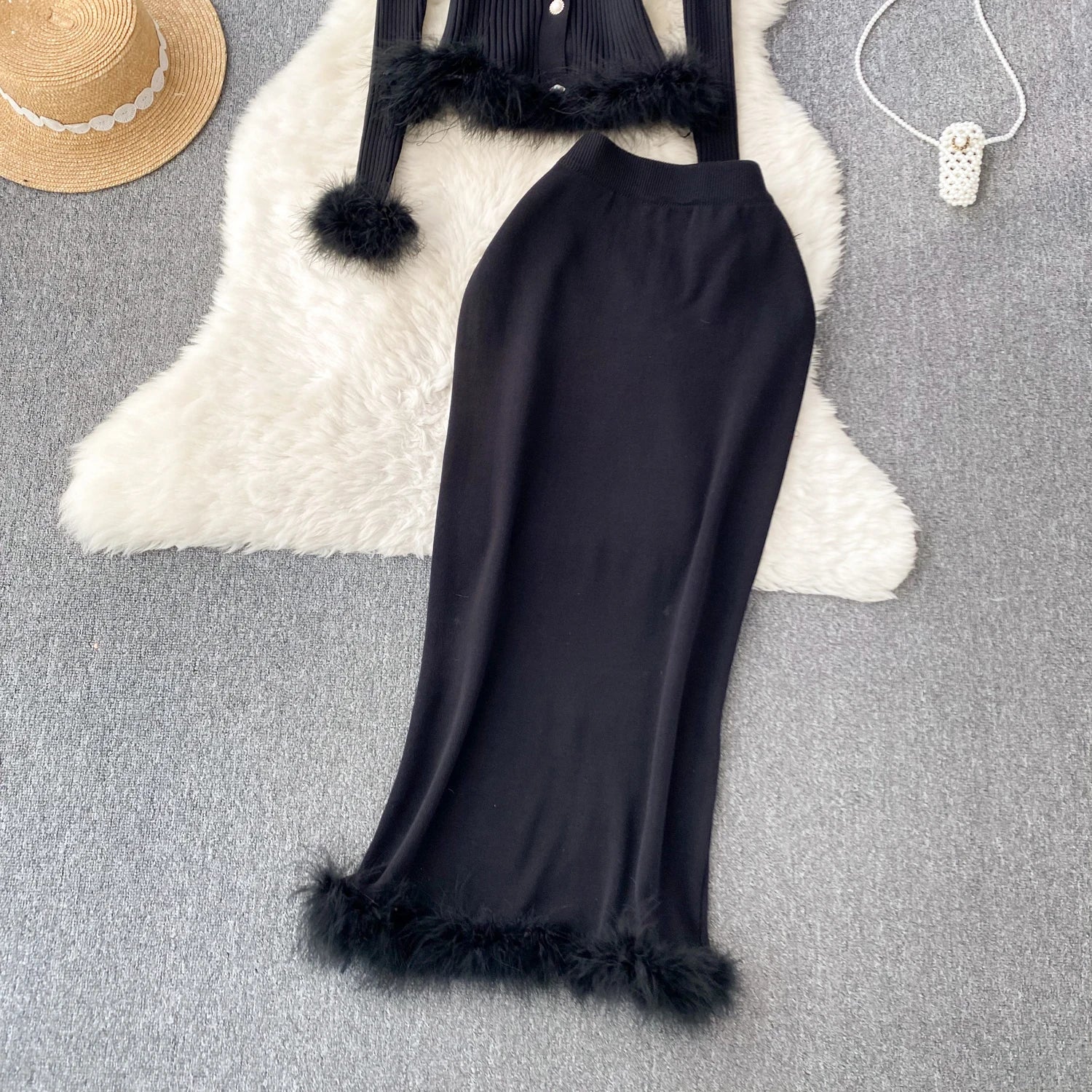 Basic Sets V-Neck Button-Down Knitted Blouse + High Quality Elastic Waist Bodycon Skirt