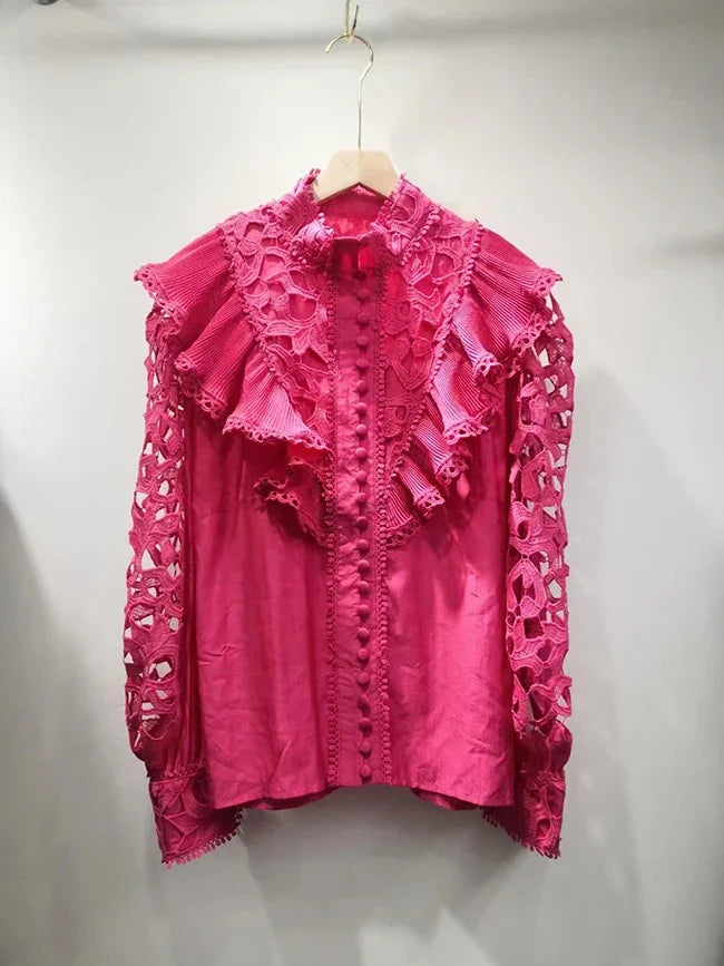 Introducing our Spring Fall Palace Style Women White Lace Ruffles Shirt, a luxurious and exclusive piece for the sophisticated woman. With its long puff sleeves and stand neck, this blouse exudes elegance and grace. The delicate lace and ruffle details add a touch of femininity, while the hollow out design adds a hint of sexiness. Perfect for any occasion, this top will elevate your style to new heights.