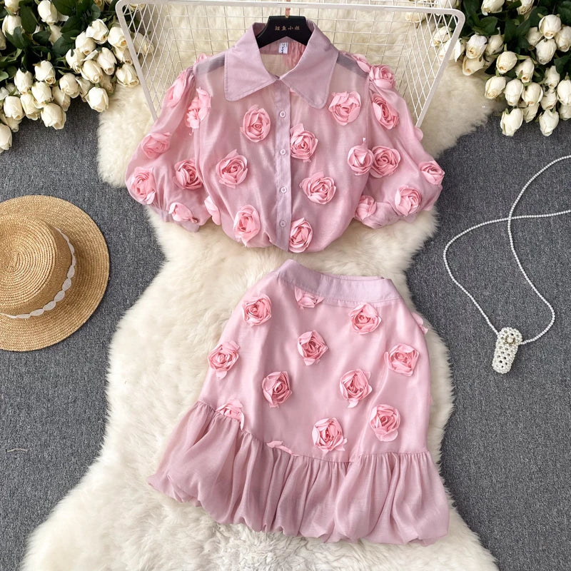 High Quality 3D Flower Embroidery Puff Sleeve Shirt and Mini Skirt Set