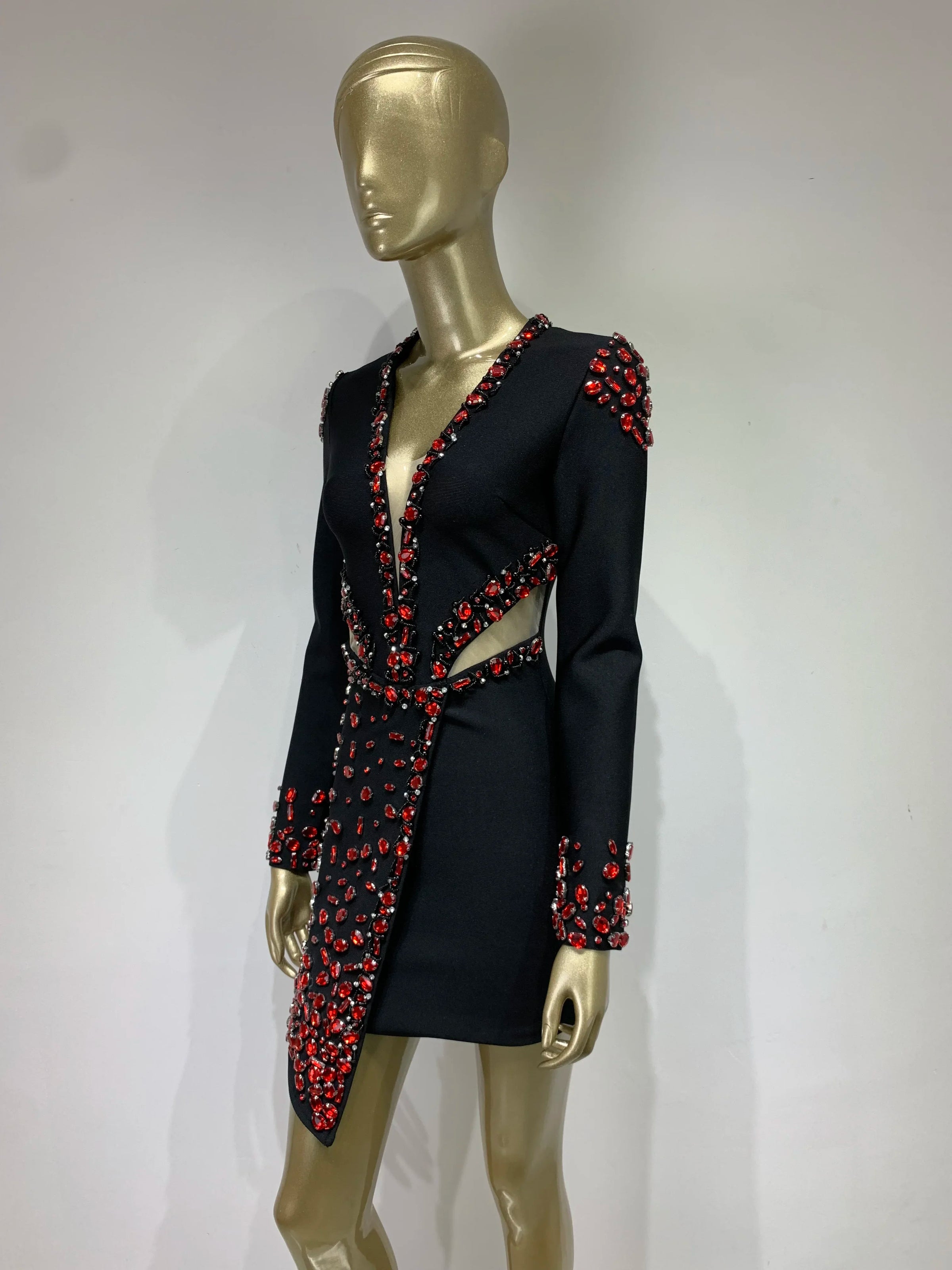High Quality Elegant V Neck Long Sleeve Sexy Diamond Beading Black Bandage Mini Dress