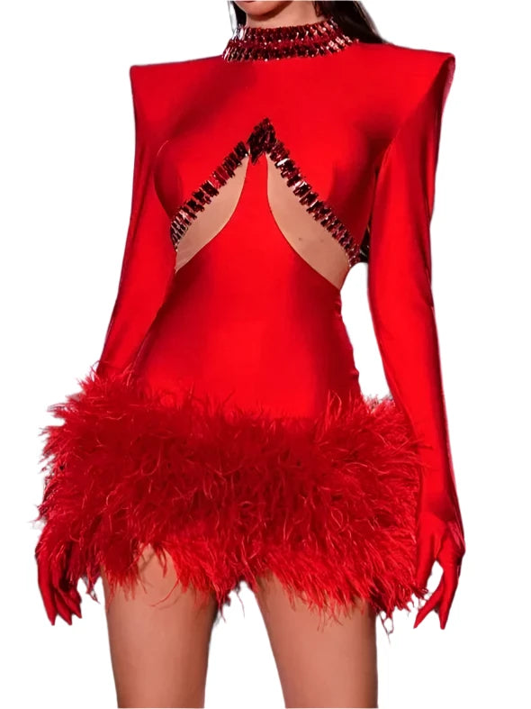 High Quality Feather Beaded Luxury Sexy Long Sleeve Red Bandage Mini Dress