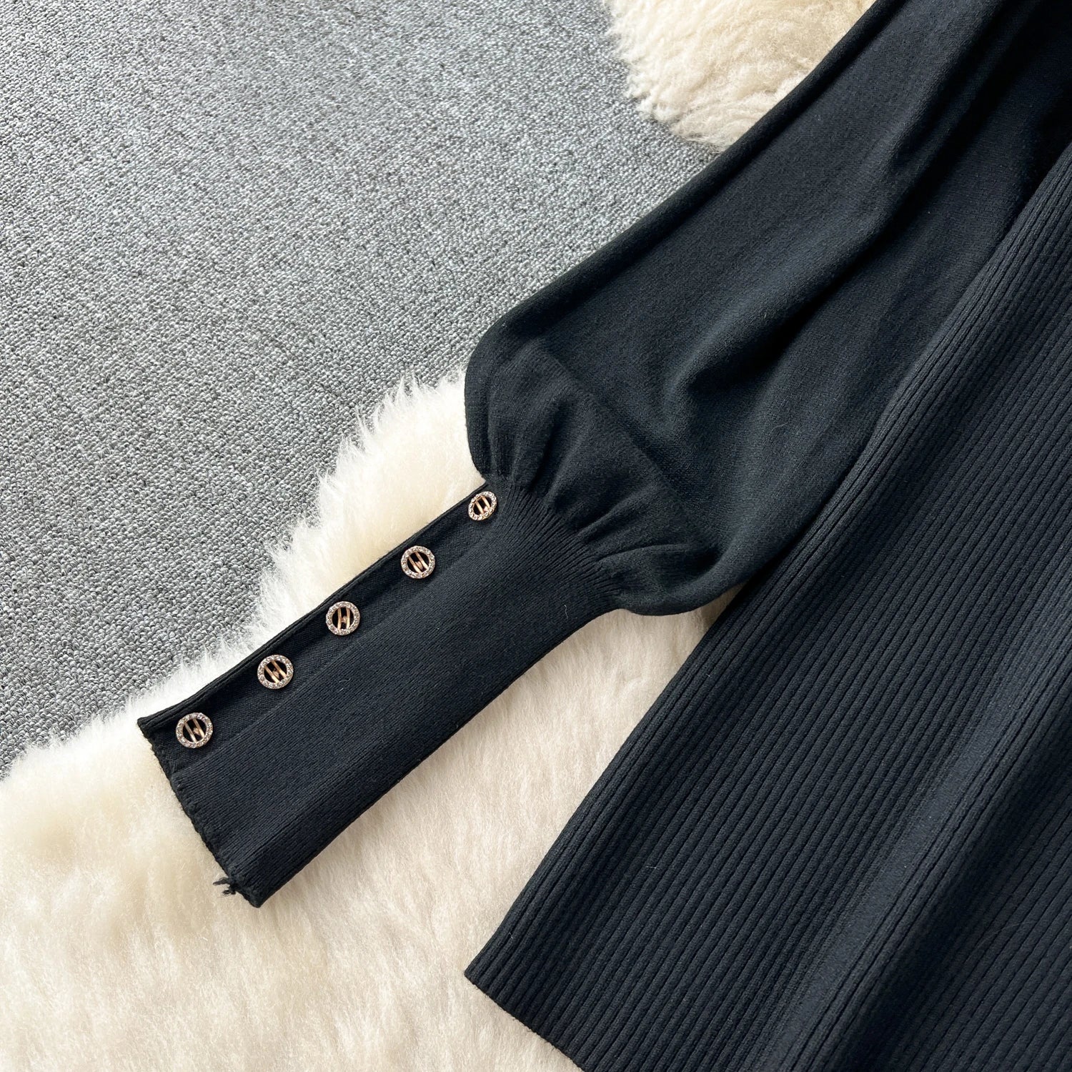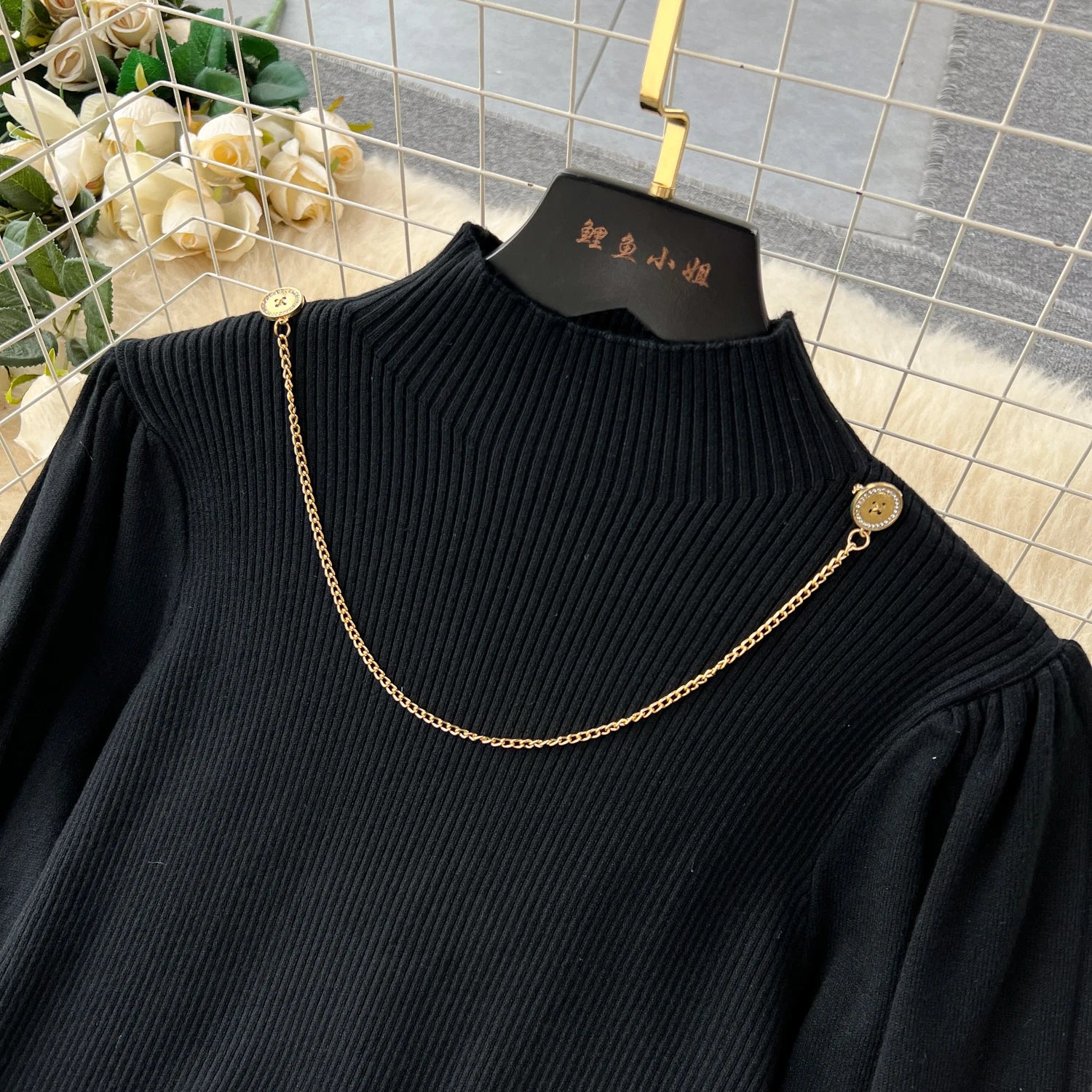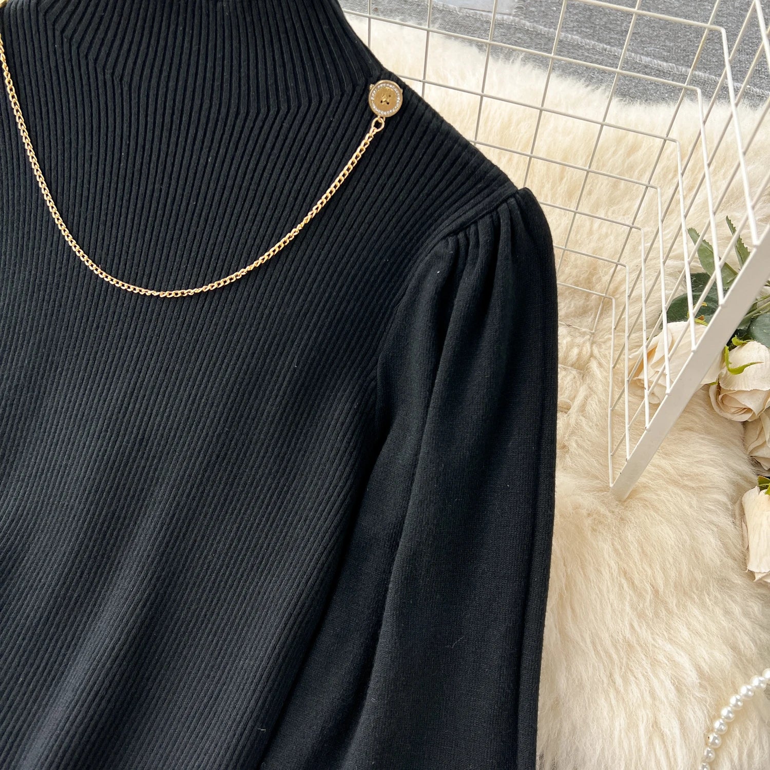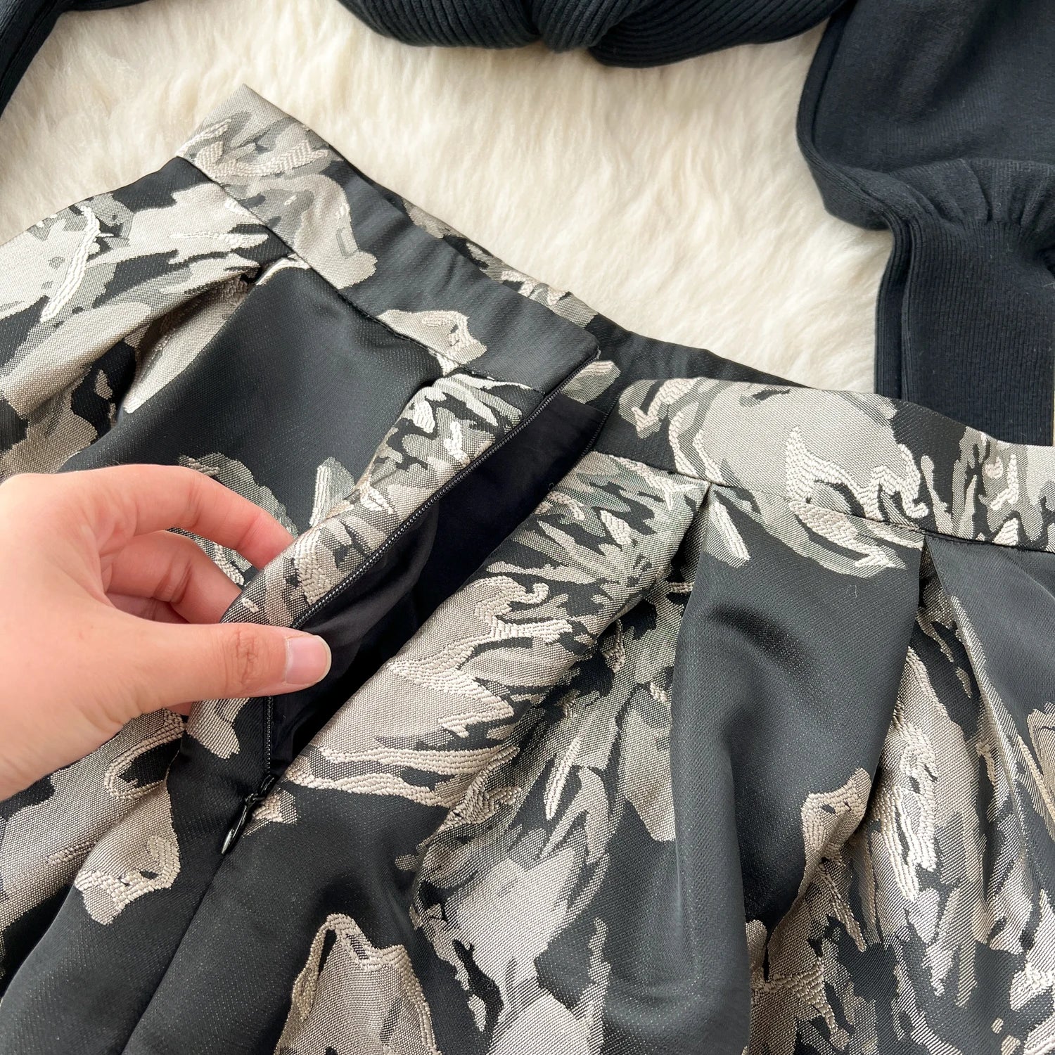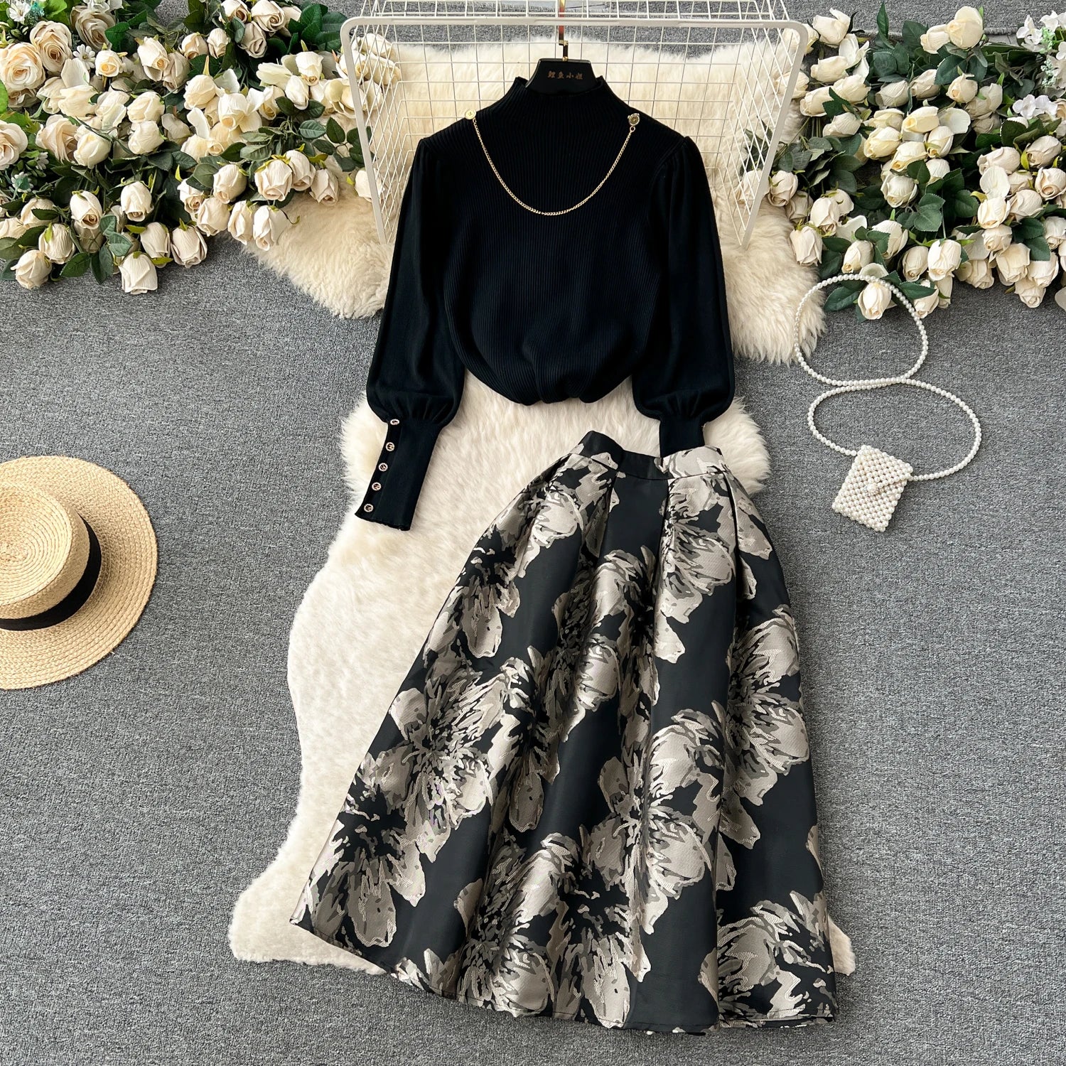Enjoy the elegance and exclusivity of our vintage two-piece set for women. Made of high-quality fabric, this set includes a warm black knit top and a floral-print jacquard A-line skirt. Perfect to show off a comfortable and feminine look in autumn and winter.